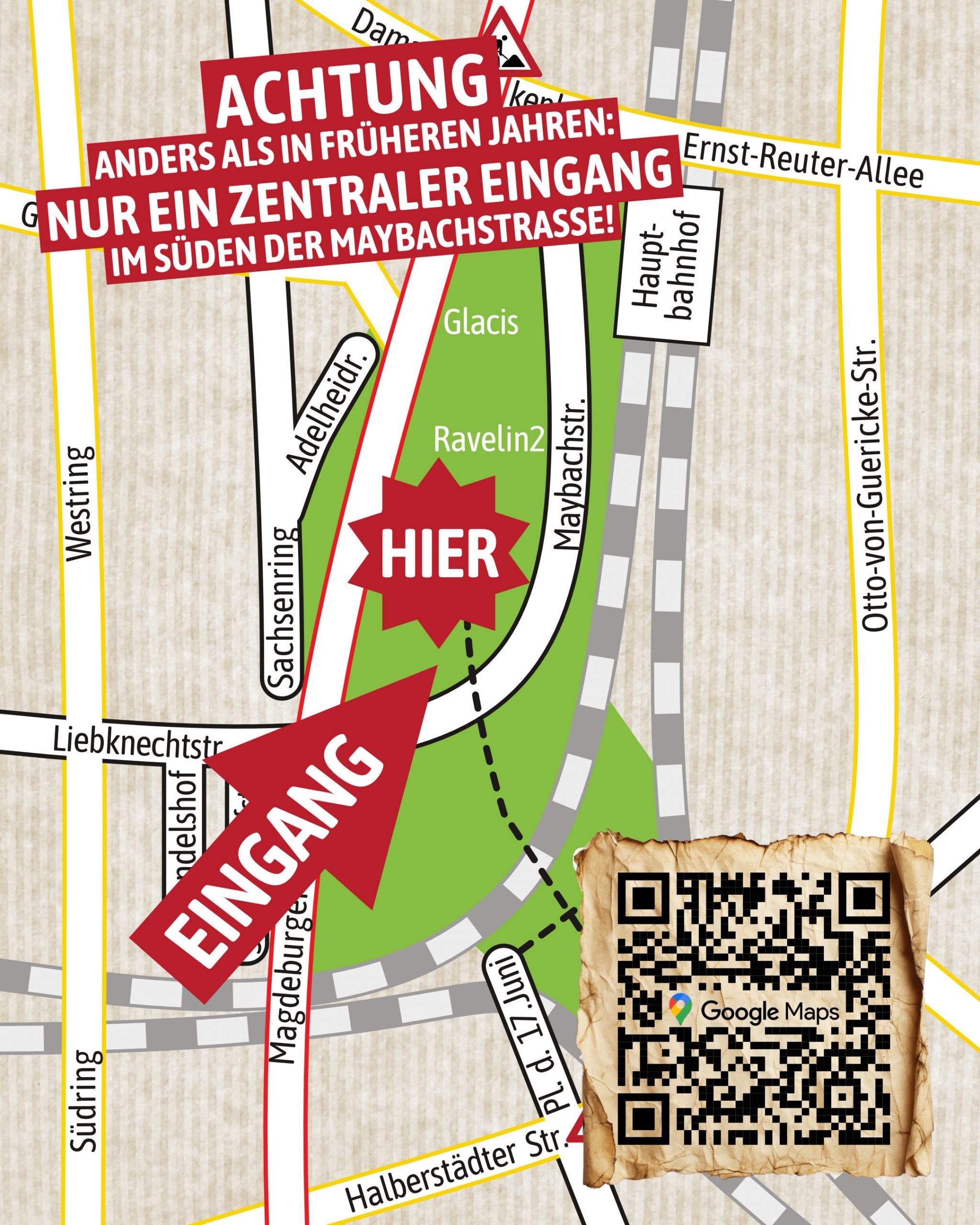 NEU ab 2025: Ein zentraler Ein- und Ausgang an der Maybachstraße / Liebknechtstraße führt auf das bzw. vom Veranstaltungsgelände.